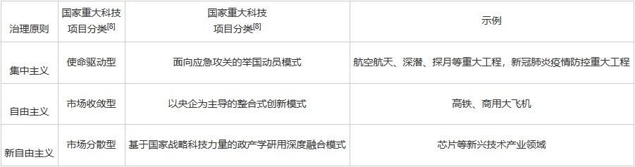 陈劲等(2021)根据新型举国体制的理论逻辑、落地模式与应用场景将重大科技项目分为面向应急攻关的举国动员模式、基于国家战略科技力量的政产学研用深度融合模式以及以央企为主导的整合式创新模式三种类型[18]。其中,面向应急攻关的举国动员模式对应于集中主义治理原则。以央企为主导的整合式创新模式对应于自由主义治理原则,因为这一模式需要以央企为主导,民营企业广泛参与,构建一个“央企+民企”的融通创新共同体,形成强协同、弱耦合的创新生态。基于国家战略科技力量的政产学研用深度融合模式对应于新自由主义治理原则,因为这一类重大科技项目聚焦于原创性、引领性、基础性、共性技术的科技攻关,需要给予科学家和科学共同体一个更为宽松的环境。