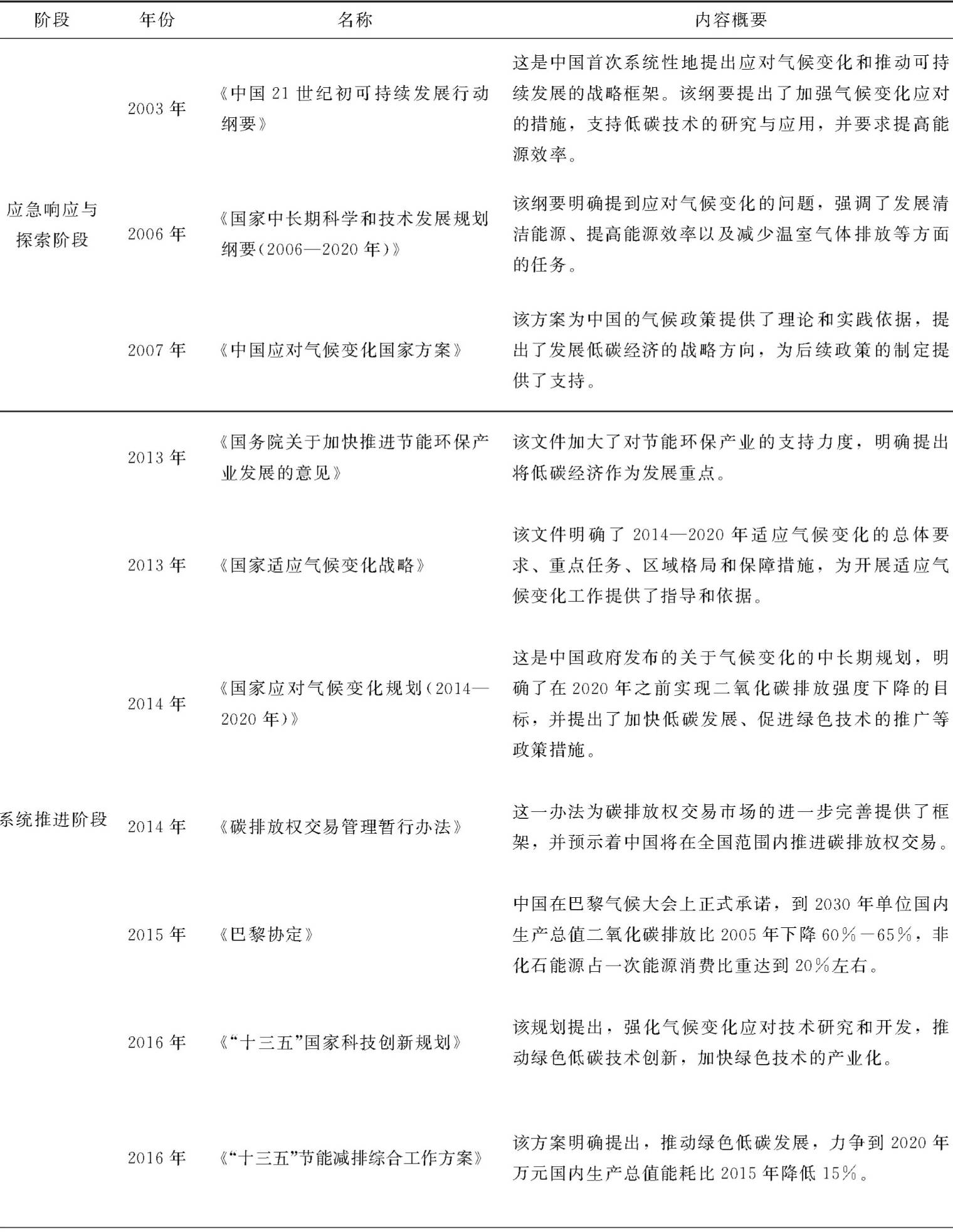 中国始终高度重视应对气候变化,将积极应对气候变化作为实现自身可持续发展的内在要求和推动构建人类命运共同体的责任担当。进入21世纪以来,为应对气候变化,中国出台了多项政策,相关政策梳理如表1所示。中国应对气候变化政策的特点如下: