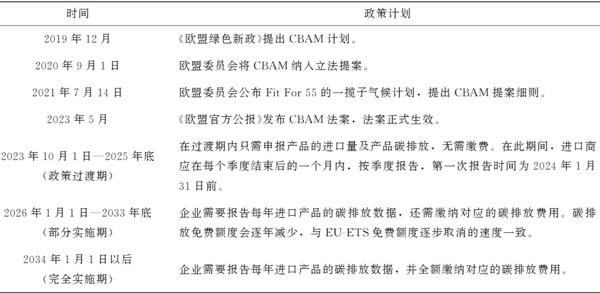 全球市场竞争日益激烈,各国在推动绿色转型的同时,也逐步引入绿色贸易壁垒,这对中国传统产业带来了新的挑战。碳关税作为绿色贸易壁垒的典型措施,正在成为国际贸易领域的焦点。碳关税的推行,如欧盟碳边境调节机制(Carbon Border Adjustment Mechanism,CBAM)(重要时间节点见表2),不仅会对全球供应链产生深远影响,还对中国的出口型企业,特别是高碳排放出口型企业,带来巨大压力。