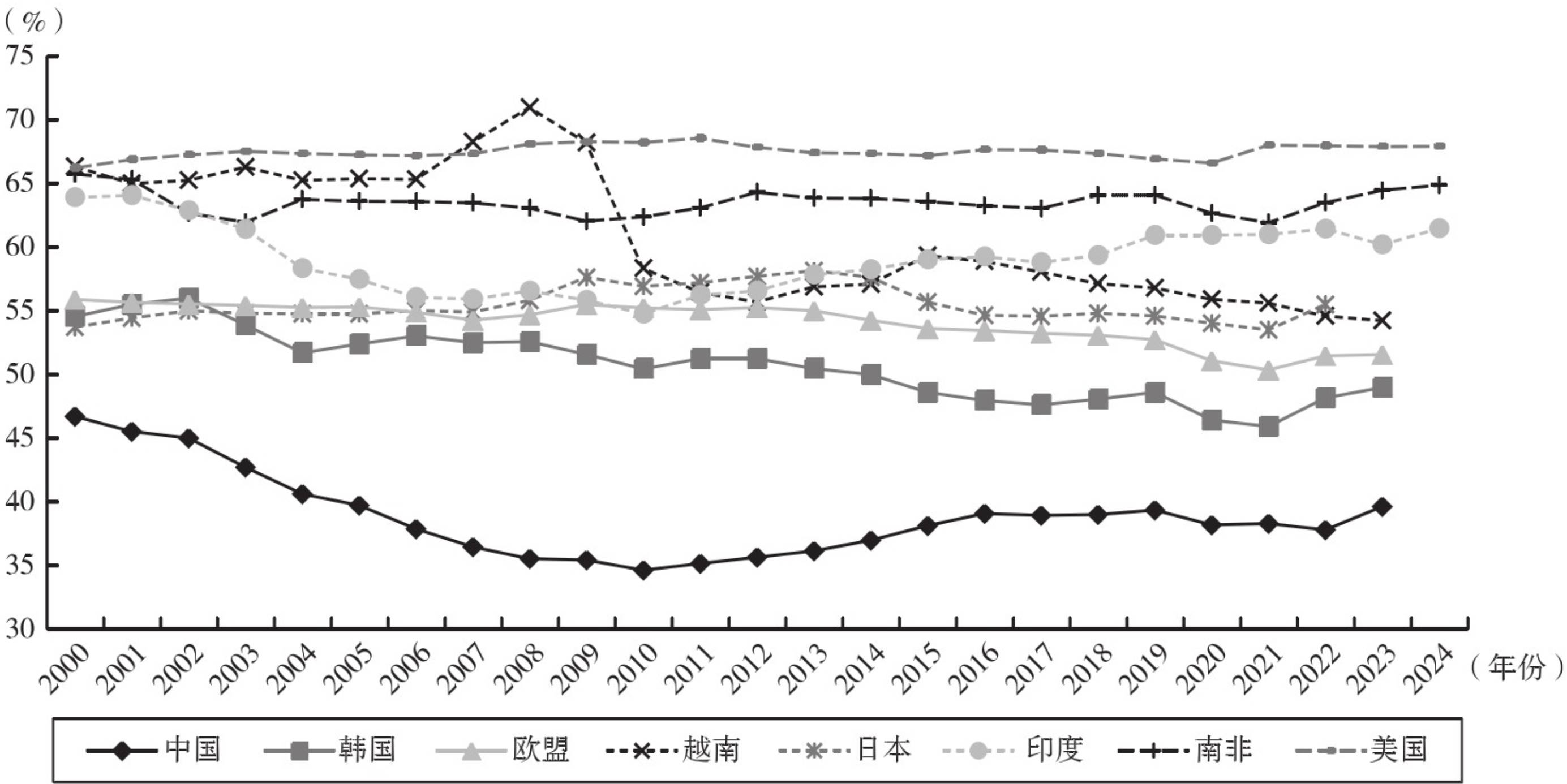 图1 2000—2024年部分国家居民最终消费占GDP比重