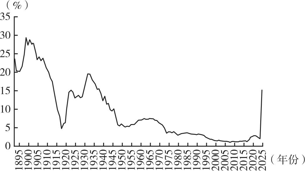 (3)贸易环境恶化,全球治理体系面临严峻挑战。当前,国际贸易环境正在经历二战以来最深刻的变革,出现了前所未有的复杂变局和不确定性。某些国家采用了有悖于比较优势和国际分工的政策工具,其中美国关税水平发生了世纪性、导向性逆转(见图1),导致自冷战结束后形成的全球化格局和多边体制式微,碎片化、多极化、双边化的新特征凸显。尤其是特朗普政府抛出“逐国定关税”的做法,对世界经济发展的政策环境造成了极大破坏,国际经贸秩序确立方式由多边谈判协调转向“一对一”要价,严重冲击了自由贸易宗旨和多边治理共识,对全球和中国经济运行带来多重风险和直接冲击。