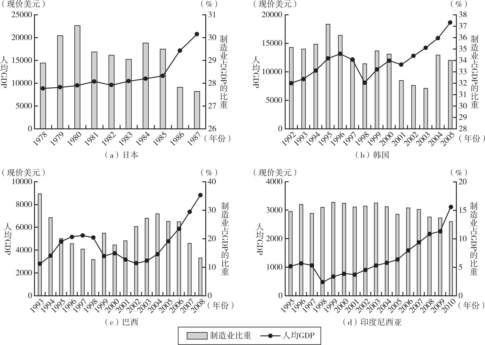 图2 典型国家制造业比重和人均GDP增长的比较