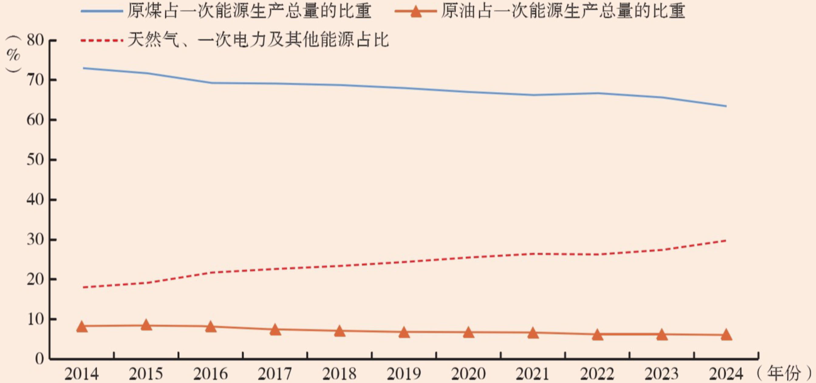 的比重稳定下降,分别从73.5%、8.3%下降至63.9%、6.1%;天然气、一次电力及其他能源的占比持续提高,从18.2%增长至30%;煤电机组改造升级持续推进,2024年,煤电机组淘汰产能超800万千瓦,改造升级1.8亿千瓦;清洁能源发电占比不断提高,规模以上工业水电、核电、太阳能发电和风电占比已提高至32.6%,全国已建成投运新型储能项目累计装机1.68亿千瓦时。能源供给智能化水平稳定提高,供给体系更加高效。如智能化煤炭产能比重已经超过五成,大中型煤矿原煤生产综合能耗已下降至2023年的9千克标煤/吨,发电机电站供热总效率从2014年的43.5%增长至2022年的47.9%(袁惊柱,2025)。