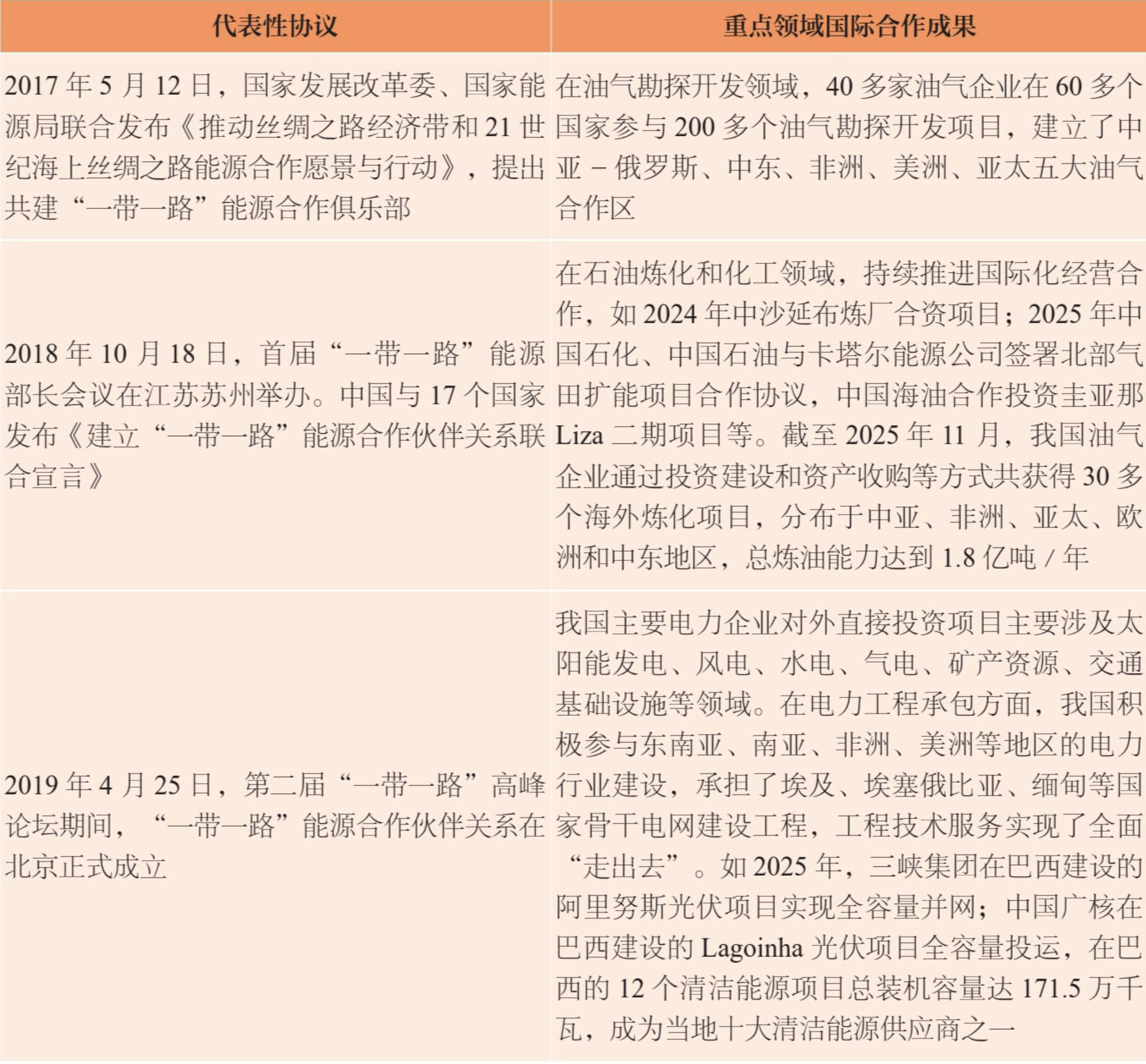在习近平总书记“要全方位加强国际合作,实现开放条件下能源安全”的引领下,我国始终秉持共商共建共享的原则,共同促进全球能源可持续发展,并积极参与全球能源治理体系建设。将能源合作作为共建“一带一路”的重点领域,并为能源国际合作打造市场化、法治化和国际化的营商环境。中国先后与东盟等6大区域搭建能源合作平台,与34个国家建立“一带一路”能源合作伙伴关系,与90多个国家和地区建立政府间能源合作机制,与10多个国家和地区开展双边能源合作规划,与30多个能源类国际组织、多边机制建立合作关系(肖新建,2023;国务院新闻办公室,2025)。油气基础设施互联互通、与周边国家电网互联互通、产能合作取得阶段性进展。积极推动能源绿色低碳转型,并加强能源治理体系建设,不断完善适应绿色低碳转型的能源标准体系建设,已基本实现能源行业各领域标准化技术委员会全覆盖,发布了系列国家标准和行业标准,并积极参与能源标准化国际合作。大力发展可再生能源,推动共建“一带一路”绿色能源合作,积极构建中国特色的“2+6+N”能源国际合作机制,已与100多个国家和地区开展了绿色能源项目合作(杨梓,2022;胡明,2025)。积极主动落实联合国2030年可持续发展议程,在应对全球气候变化挑战中积极贡献中国力量,以光伏发电、风电、锂电池、新能源汽车等大量绿色低碳能源产品设备,为全球能源转型提供了重要支撑,在提升全球能源可及性和共建人类命运共同体上发挥了中国的大国引领作用,提供了中国方案,贡献了中国智慧。