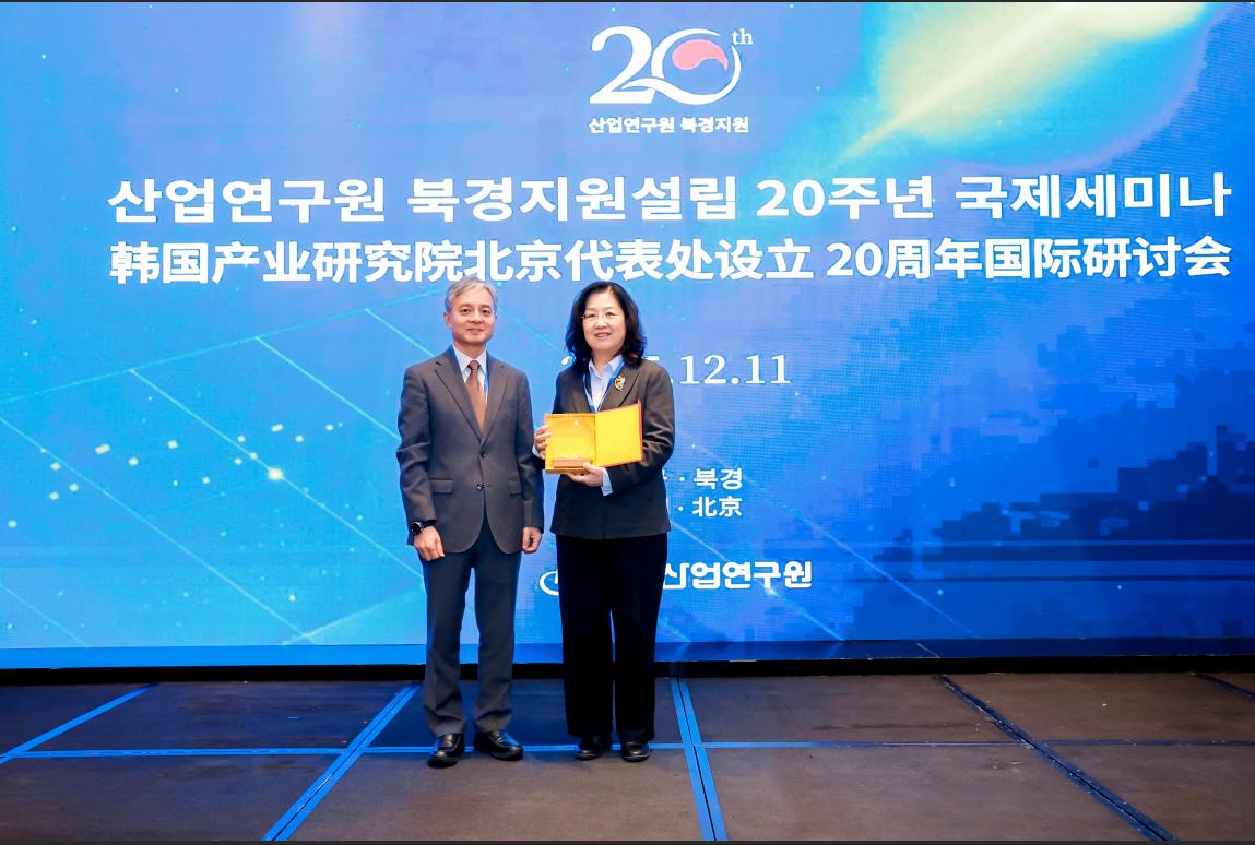 2025年12月11日下午,史丹学部委员受邀参加韩国产业研究院北京代表处成立20周年国际研讨会,并与韩国产业研究院北京代表处原首席代表李玟炯教授一起,荣获韩国产业研究院颁发的北京代表处成立20周年纪念“感谢牌”。中国社会科学院工业经济研究所与韩国产业研究院作为两国产业经济研究领域的重要机构,渊源深厚、合作紧密。2005年,韩国产业研究院北京代表处成立。2011年以来,工业经济研究所与韩国产业研究院成功举办了十六届“中韩产业论坛”,论坛议题从早期的产业结构优化、战略性新兴产业,逐步拓展到绿色增长、碳中和、数字经济、人工智能等前沿领域。史丹学部委员重点回顾了历届“中韩产业论坛”的合作往事,就“中韩产业论坛”紧密契合时代发展脉搏,在政策沟通、智库交流、学术对话和产业互信上的作用予以充分肯定,对韩国产业研究院北京代表处成立20周年表示热烈祝贺,并期许“中韩产业论坛”继续成为两国学术界与产业界交流思想、分享智慧、凝聚共识的重要平台。